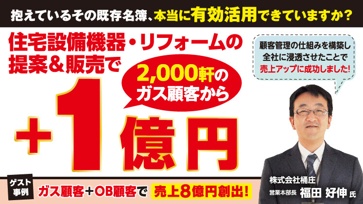 など、ガス会社様が持っている既存名簿という「宝の山」を最大限に活用し、売上を伸ばすノウハウを成功事例を交えながら具体的にお伝えします。